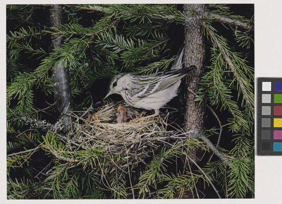 u.l. [stamp]: PHOTOGRAPH \ By \ ELIOT PORTER \ No. [in ink]: 15-13-45-30 \ [stamp]: Title [in ink]: Black Poll Warbler, [female symbol]