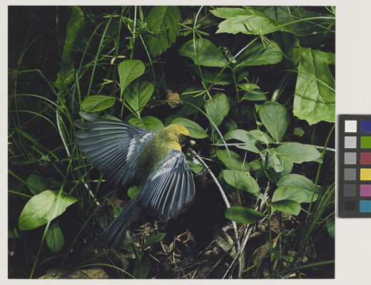 u.l. [stamp]: PHOTOGRAPH \ By \ ELIOT PORTER \ No. [in ink]: 15-13-23-29 \ [stamp]: Title [in ink]: Blue-winged Warbler, [male symbol]