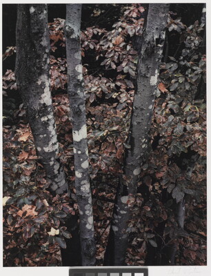 u.l. [stamp]: PHOTOGRAPH \ By \ ELIOT PORTER \ No. [in ink]: 52-133 \ [stamp]: Title [in ink]: BLUEBERRY LEAVES AND MAPLE TRUNKS \ NEW HAMPSHIRE