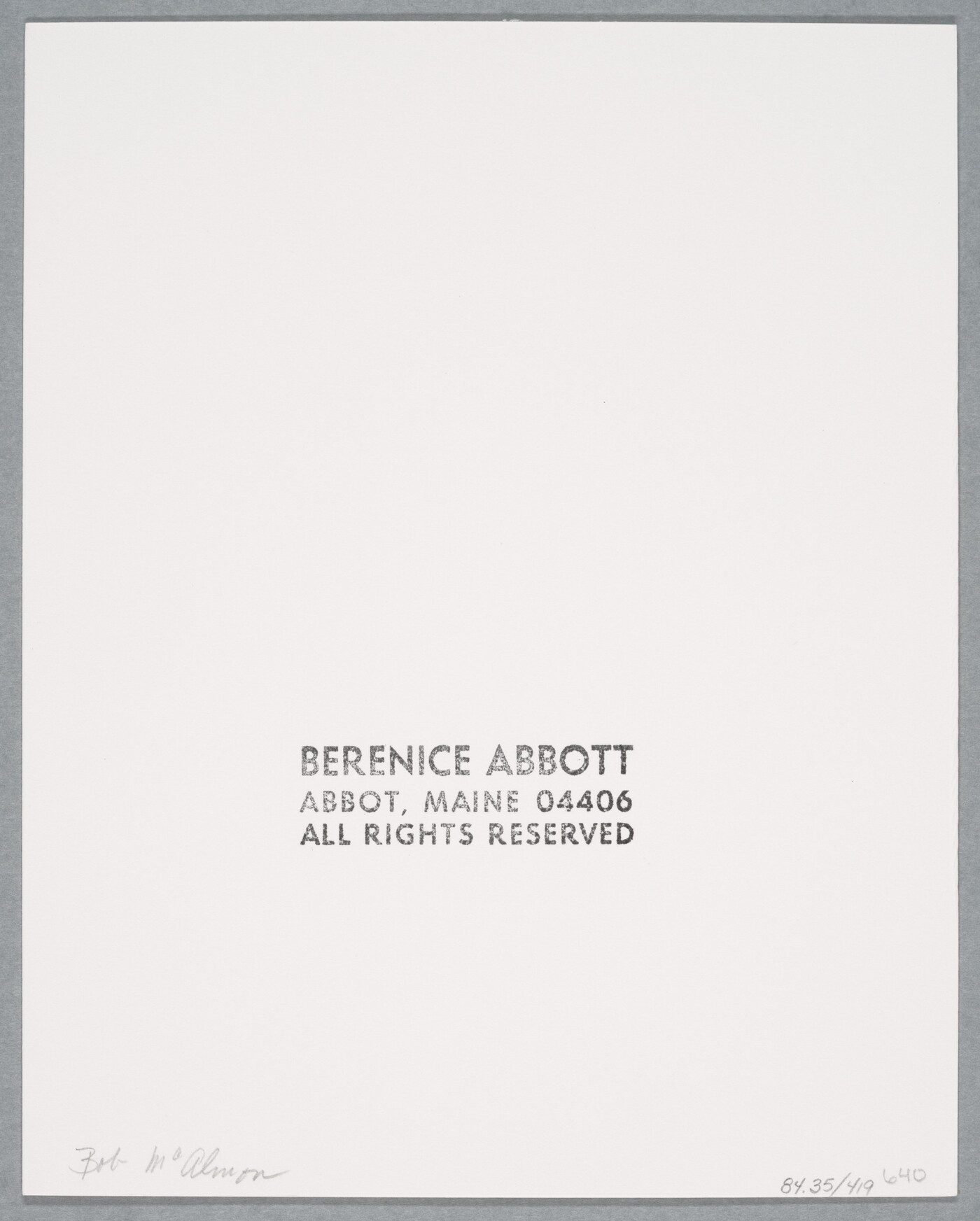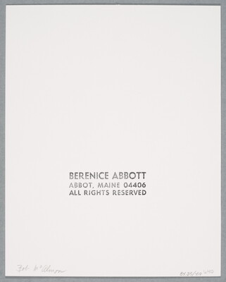 c. stamp: BERENICE ABBOTT \ ABBOT, MAINE 04406 \ ALL RIGHTS RESERVED