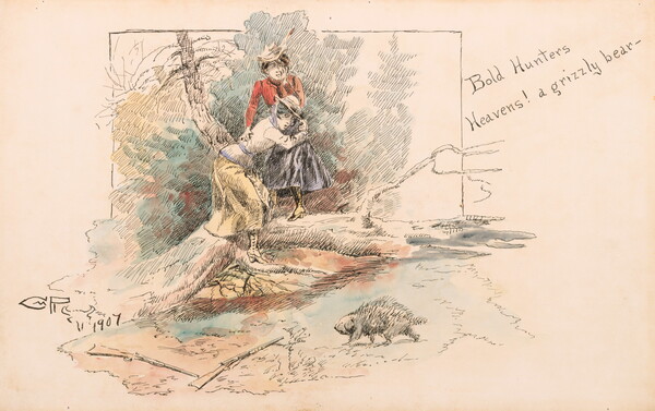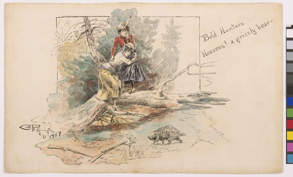 u.r. inscribed in ink: Bold Hunters \ Heavens! a grizzly bear--