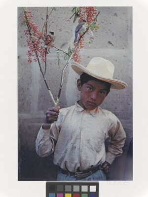 u.l. [stamp]: PHOTOGRAPH \ By \ ELIOT PORTER \ No. [in ink]: ROLL 19, NO. 13, 1956 \ [stamp]: Title [in ink]: BOY WITH BIRDS, \ MORELIA, MEXICO