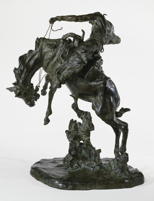 On the rounded edge of the base, directly below the left foot of the rider and the left shoulder of the horse: C M Russell \ c [circled] [Note: "c" is actually illegible] [skull]