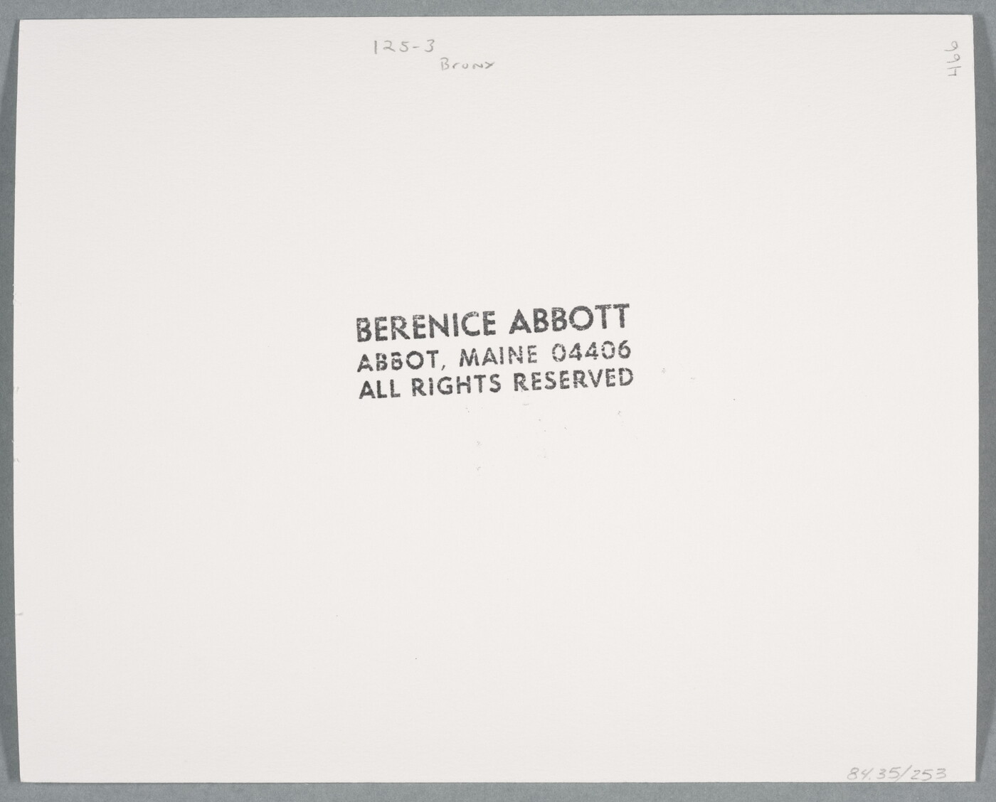 c. [stamp]: BERENICE ABBOTT \ ABBOT, MAINE 04406 \ ALL RIGHTS RESERVED