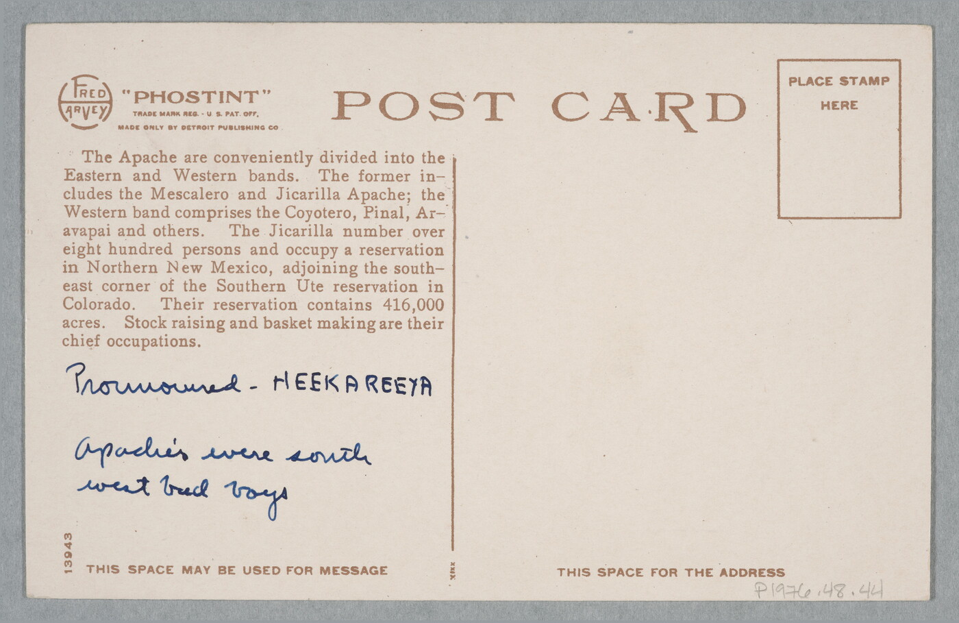 l.l. in blue ink: Pronounced - HEEKAREEYA \ Apache's were south \ west bad boys