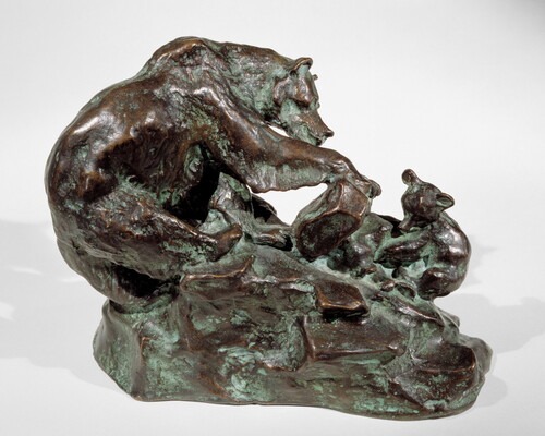 On the vertical edge of the base, at the bottom, directly below the mother bear's left flank: CALIF. ART BRONZE FNRY LA