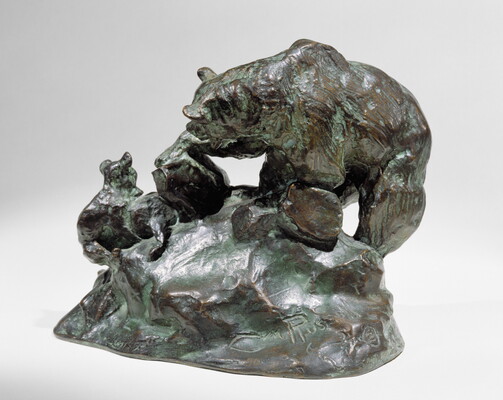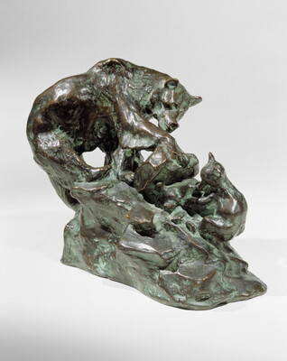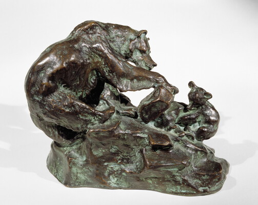 On the rounded edge of the base, directly below the left front shoulder of the mother bear: C M Russell \ [skull] c [circled]