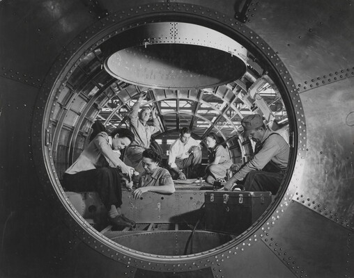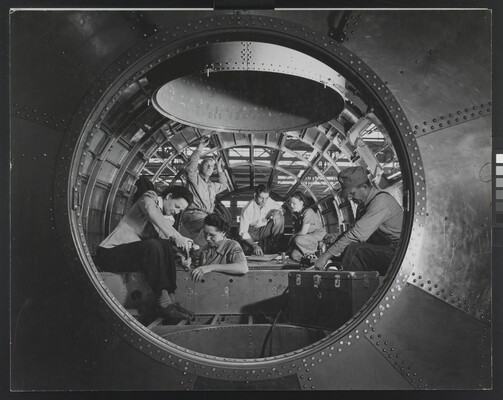 u.c. on paper label: [printed]: A PHOTOGRAPH BY \ LAURA GILPIN \ SANTA FE, NEW MEXICO \ [typed]: BUILDING A B 29 BOMBER AT \ WICHITA, KANSAS \ 1944 \ Courtesy of THE BOEING AIRPLANE CO.