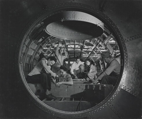 u.c. [paper label]: A PHOTOGRAPH \ By LAURA GILPIN \ COLORADO SPRINGS COLORADO \ TITLE: BUILDING A BOMBER. \ COURTESY BOEING WITCHITA.
