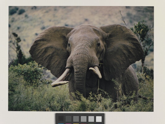 u.l. [stamp]: PHOTOGRAPH \ By \ ELIOT PORTER \ No. [in ink]: Roll 10, No. 25 \ [stamp]: Title [in ink]: bull Elephant \ Marsabit Park \ Kenya 1970