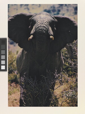 u.l. [stamp]: PHOTOGRAPH \ By \ ELIOT PORTER \ No. [in ink]: Roll 67, No. 19 \ [stamp]: Title [in ink]: Bull Elephant \ Serengeti, Tanzania \ 1970