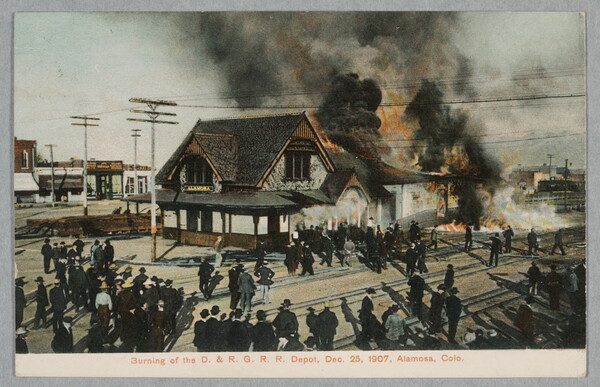 l.c. printed in red, below image: Burning of the D. & R.G.R.R. Depot, Dec. 25, 1907, Alamosa, Colo.