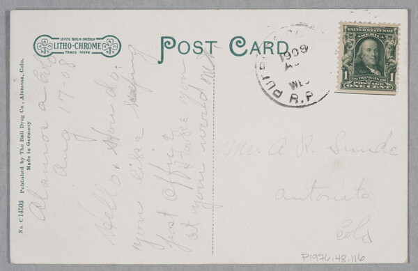 c.l. printed along left edge: No. c14503 Published by The Ball Drug Co., Alamosa, Colo. \ Made in Germany