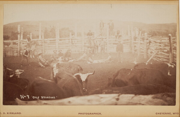 printed label: Kirkland's \ VIEWS OF COW-BOY LIFE \ AND THE CATTLE BUSINESS. The photograph, of which the following is a list, were taken \ on the line of the Union Pacific Railroad (the Overland Route), \ and illustrate graphically and truthfully the cattle business of the \ Great West. The views have been taken instantaneously from \ life, and are finely finished and elegantly mounted on five-inch \ by eight-inch cards.