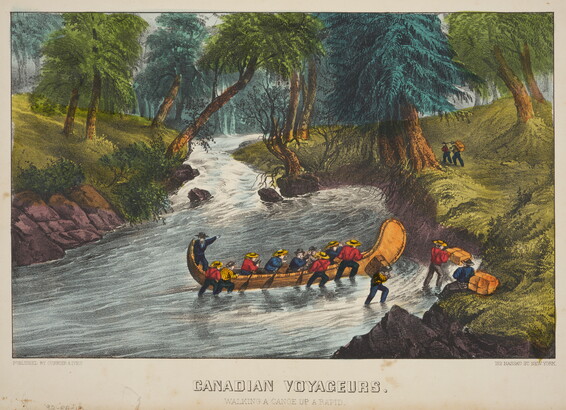 Canadian Voyageurs. Walking a Canoe up a Rapid.