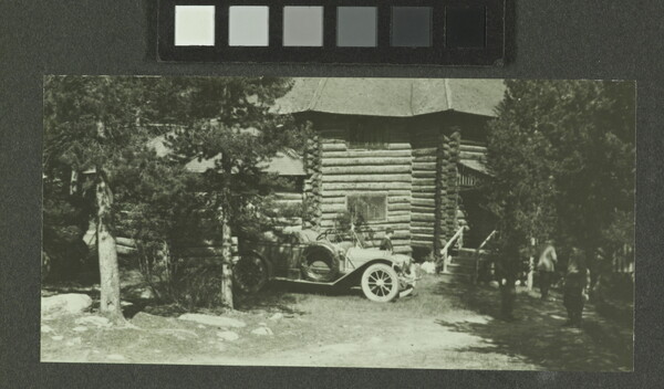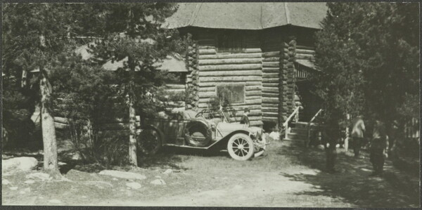 [Car parked in front of cabin]