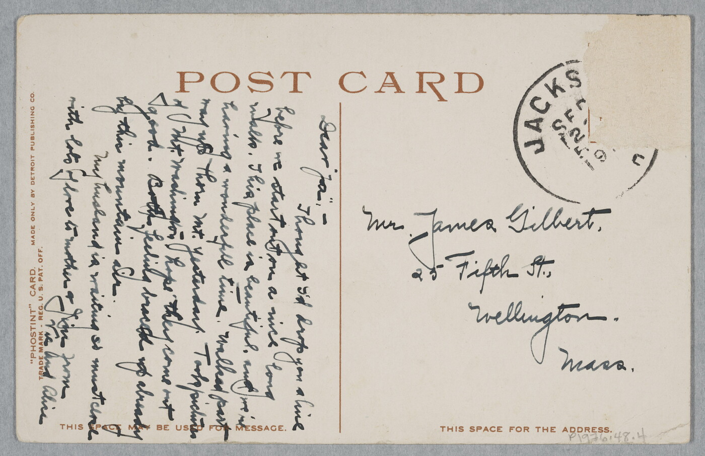c. to c.r. in ink: Mr. James Gilbert, \ 25 Fifth St., \ Wellignton, \ Mass.