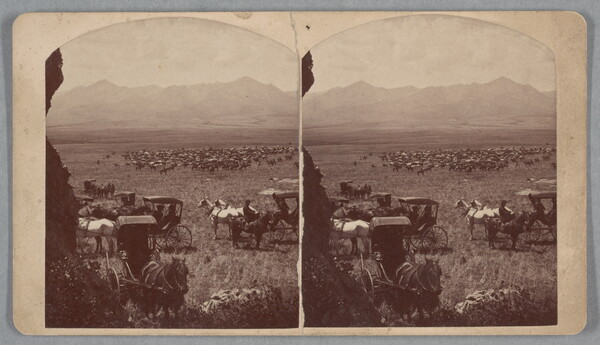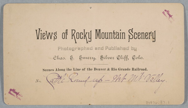 c. printed: Views of Rocky Mountain Scenery \ Photographed and Published by \ Chas. E. Emergy, Silver Cliff, Colo. \ Scenes Along the Line of the Denver & Rio Grande Railroad. \ No. [ink] Cattle Roud up - [illeg.] Mt - Valley.