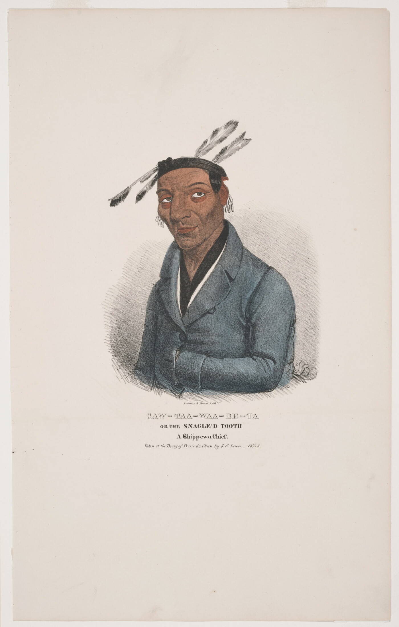 l.c.: Lehman & Duval Lith[rs]. \ CAW-TAA-WAA-BE-TA \ OR THE SNAGLE'D TOOTH \ A Chippewa Chief. \ Taken at the Treaty of Prarie [sic] du Chien by J.O. Lewis.__1825.