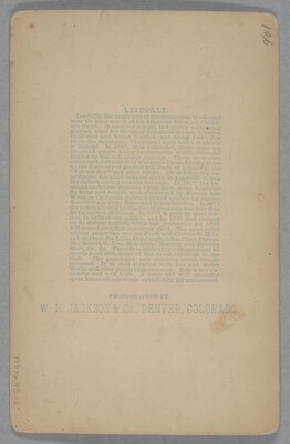 c. printed [vertical]: LEADVILLE. \ [see photograph of Verso for text] \ PHOTOGRAPHED BY \ W. H. JACKSON & CO., DENVER, COLORADO