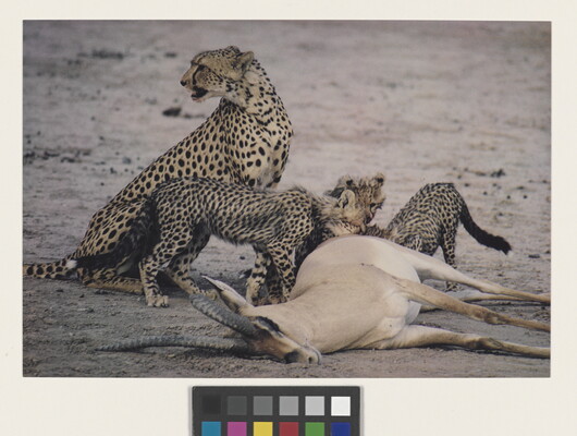 u.l. [stamp]: PHOTOGRAPH \ By \ ELIOT PORTER \ No. [in ink]: Roll 121, No. 33 \ [stamp]: Title [in ink]: Cheetah and cubs \ with prey \ Amboseli, Kenya \ 1970