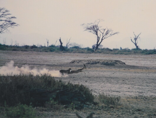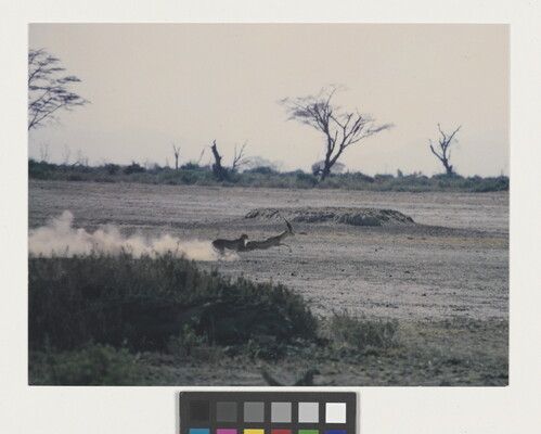 u.l. [stamp]: PHOTOGRAPH \ By \ ELIOT PORTER \ No. [in ink]: Roll 121, No.5 \ [stamp]: Title [in ink]: Cheetah chasing Grants Gazelle \ Amboseli, Kenya \ 1970