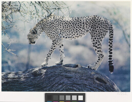 u.l. [stamp]: PHOTOGRAPH \ By \ ELIOT PORTER \ No. [in ink]: Roll 148, No. 22 \ [stamp]: Title [in ink]: Cheetah \ Serengeti, Tanzania