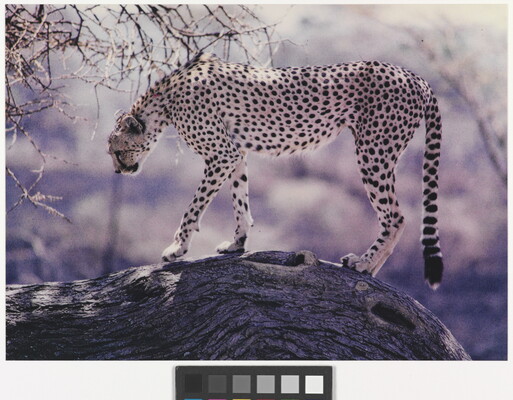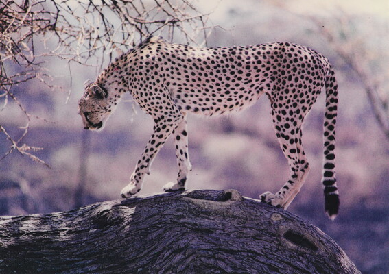 Cheetah Standing on Horizontal Tree Trunk, Serengeti, Tanzania, Africa, 1970