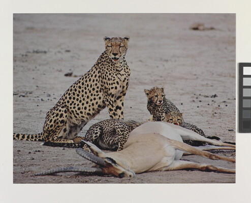u.l. [stamp]: PHOTOGRAPH \ By \ ELIOT PORTER \ No. [in ink]: 70-2167 \ [stamp]: Title [in ink]: Cheetah with kill \ Amboseli, Kenya