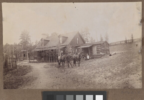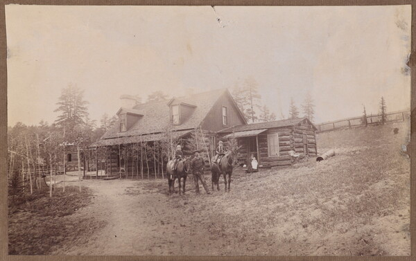 [Children on horseback in front of cabin]