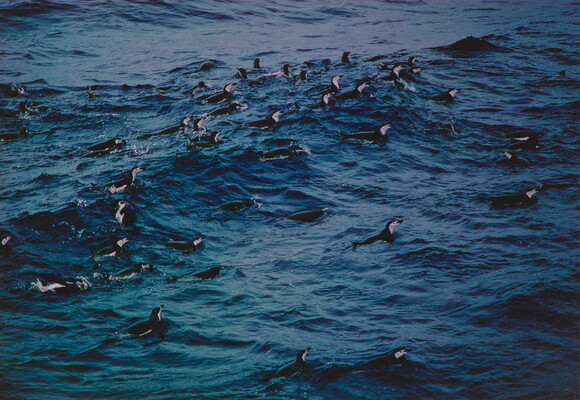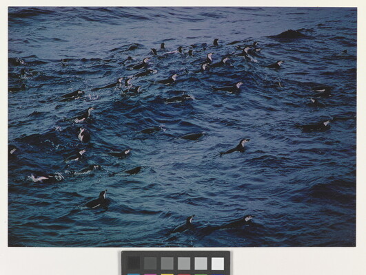 u.l. [stamp]: PHOTOGRAPH \ By \ ELIOT PORTER \ No. [in ink]: Roll 12, No. 37 \ [stamp]: Title [in ink]: Chin-strap Penguins \ Gibbs Island