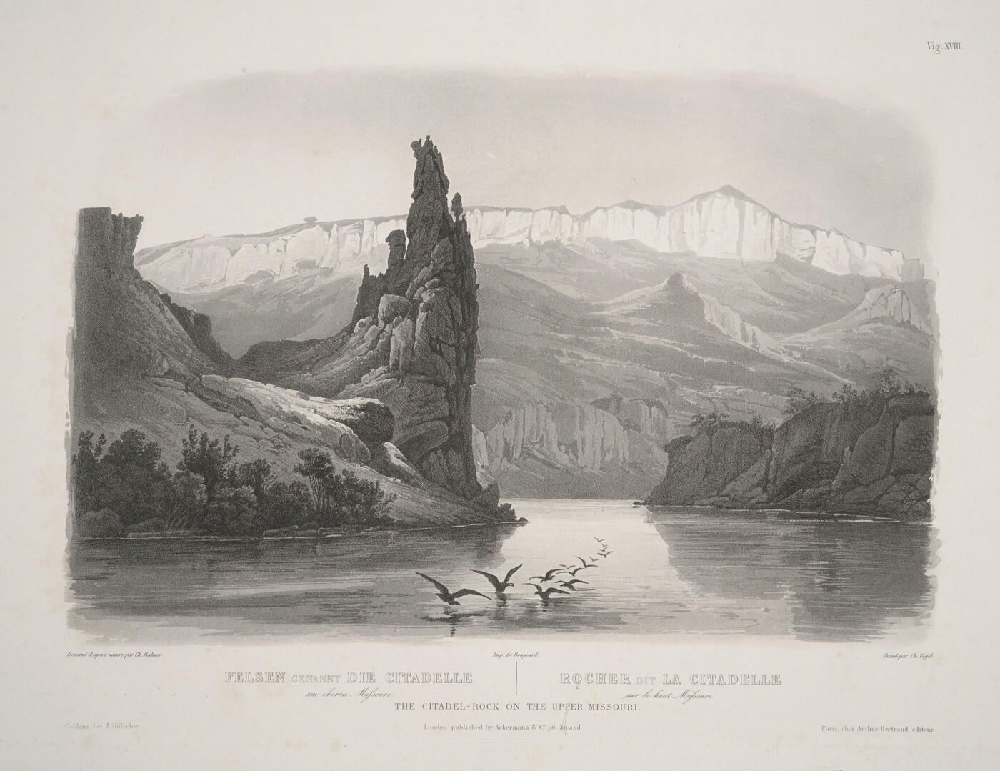 l.c. : Imp. de Bougeard \ FELSEN GENANNT DIE CITADELLE ROCHER DIT LA CITADELLE \ am oberen Missouri sur le haut Missouri \ THE CITADEL-ROCK ON THE UPPER MISSOURI \ London, published by Ackermann & Co. 96, Strand \ [blind stamp]