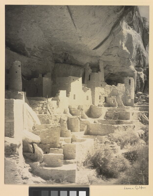 u.c. on paper label: [printed]: A : PHOTOGRAPH \ BY : LAURA : GILPIN \ TITLE [typed]: "The City of the Dead" \ Cliff Palace. Mesa Verde. [printed]: PRINT No. \ [typed]: Copyright. \ [printed]: COLORADO : SPRINGS : COLORADO