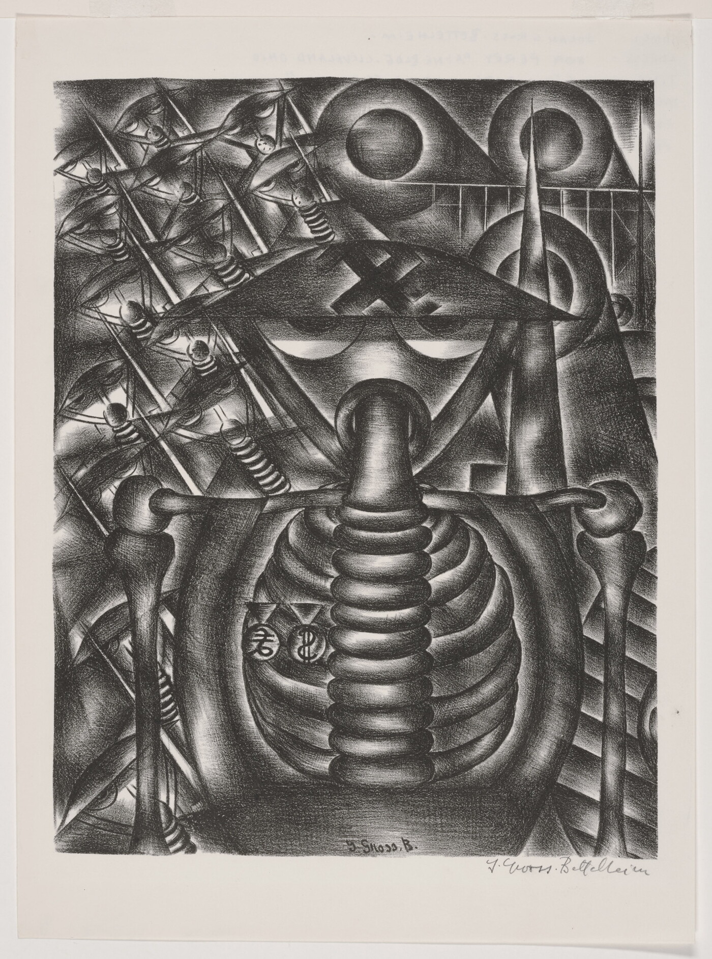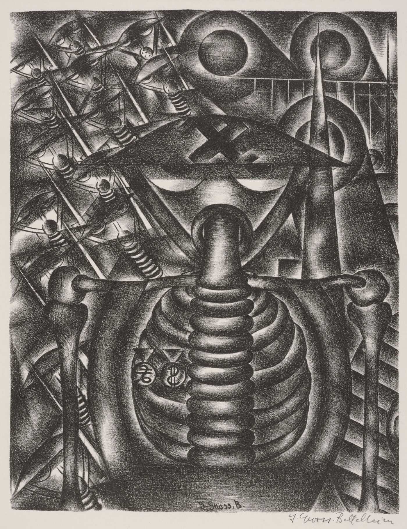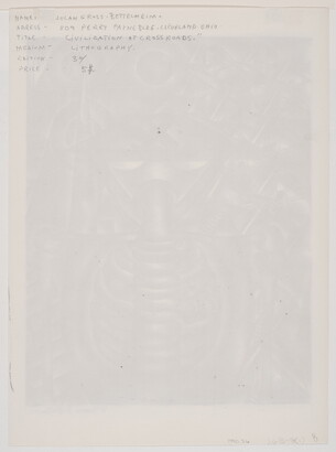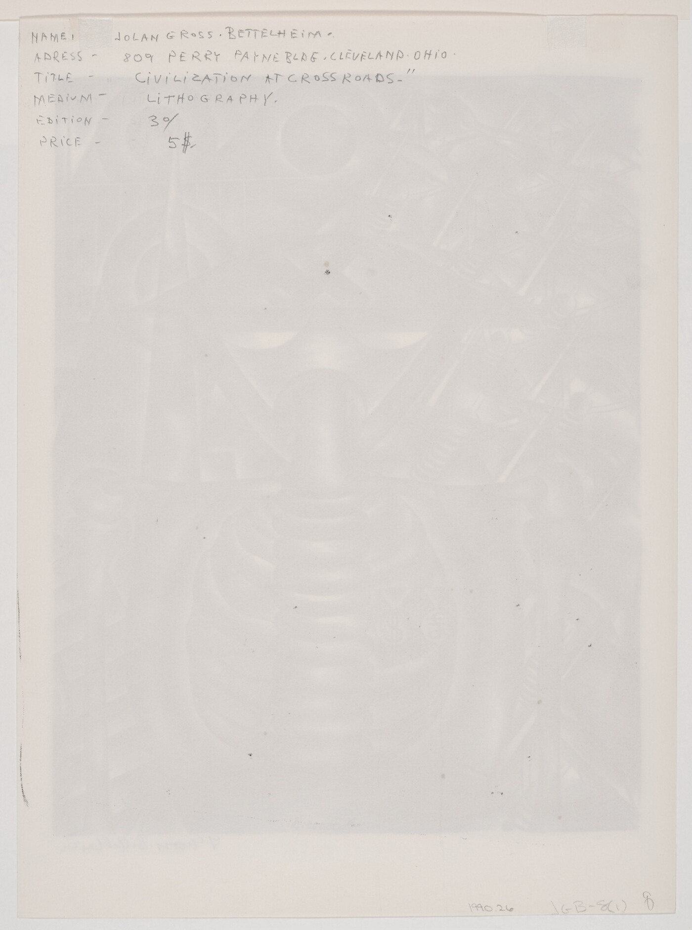 u.r. in graphite: NAME: JOLAN GROSS.BETTELHEIM \ ADRESS - 809 PERRY PAYNE BLDG. CLEVELAND, OHIO \ TiTLE: \ CiViLiZATION AT CROSSROADS \ MEDiUM: LiTHOGRAPHY \ EDiTiON: 30/ \ PRiCE: 5$.