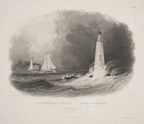 l.c.: Imp. de Bougeard \ LEUCHTTHURM BEI CLEVELAND PHARE DE CLEVELAND \ am Erie Sec. sur le Lac Erie \ CLEVELAND LIGHTHOUSE \ on the Lake Erie \ London, published by Ackermann & Co. 90, Strand \ [blind stamp]