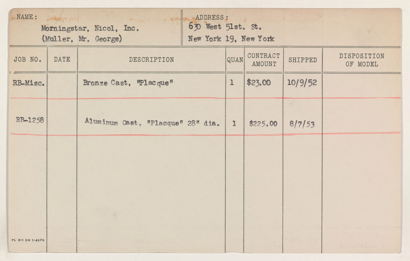 Description Muller, George, Nicol Morningstar, Inc., New York City, New York; Plaque 1952 1952 ; 1258 Plaque 1953 1953 28" diameter; aluminum cast