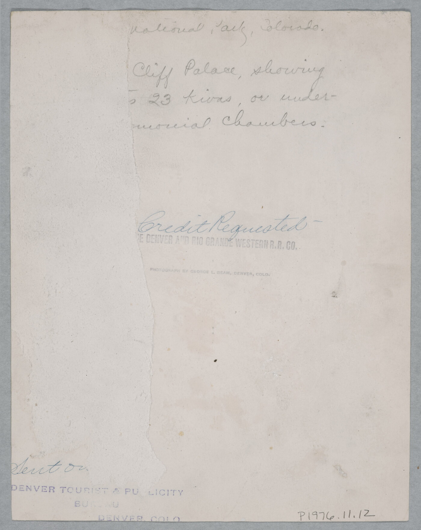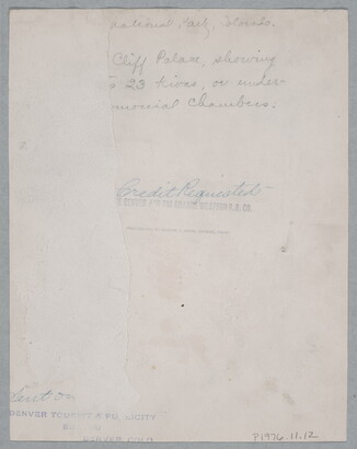 u.c. in graphite: National Park, Colorado \ cliff Palace, showing \ 23 kivas, or under - \ ---cial [illegible] chambers. [half of inscription is missing]
