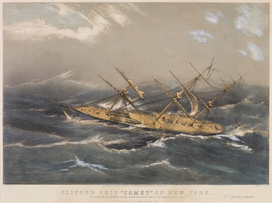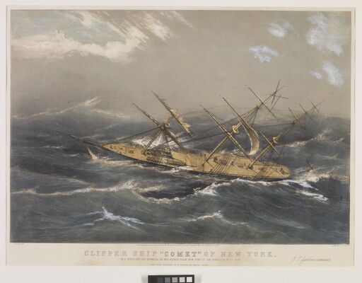 l.c.: Entered according to Act of Congress, in the year 1855 by N. Currier, in the Clerk's office in the District Court of the Southern District of N.Y. \ CLIPPER SHIP 'COMET' OF NEW YORK. \ IN A HURRICANE OFF BERMUDA, ON HER VOYAGE FROM NEW YORK TO SAN FRANCISCO, OCTR. 1852. E.C. Gardner, COMMANDER. \ NEW YORK, PUBLISHED BY N. CURRIER, 152 NASSAU STREET.