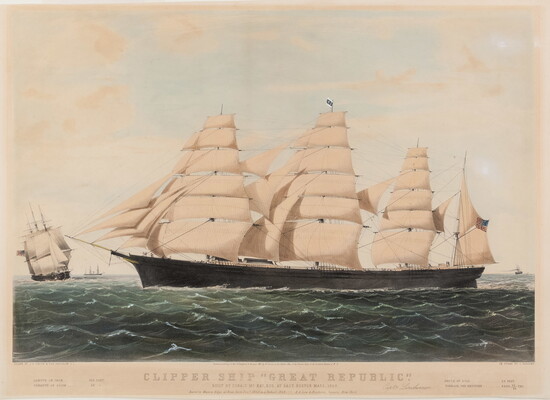 l.c.: Entered according to Act of Congress, in the year 1855 by N. Currier, in the Clerk's office of the District Court of the Southern District of N.Y. \ CLIPPER SHIP "GREAT REPUBLIC." \ BUILT BY DONALD Mc. KAY, ESQ. AT EAST BOSTON MASS 1863. \ Burnt to Walters Edge at New York Dec. 1853 and Rebuilt 1854 - A.A. Low & Brothers Owners New York