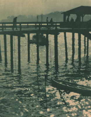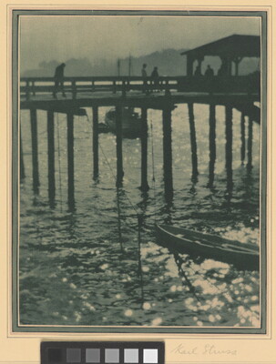 u.c. printed on paper label: AT CLOSE OF DAY \ The wharf and bay of Santa Barbara. From a pictorial photograph by Karl Struss.