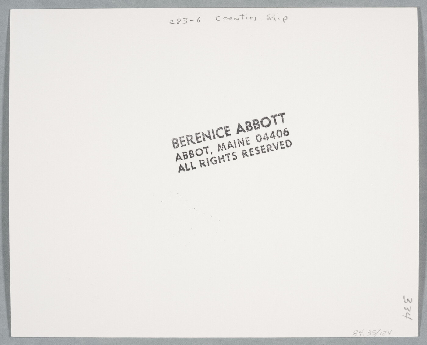 c. [stamp]: BERENICE ABBOTT \ ABBOT, MAINE 04406 \ ALL RIGHTS RESERVED