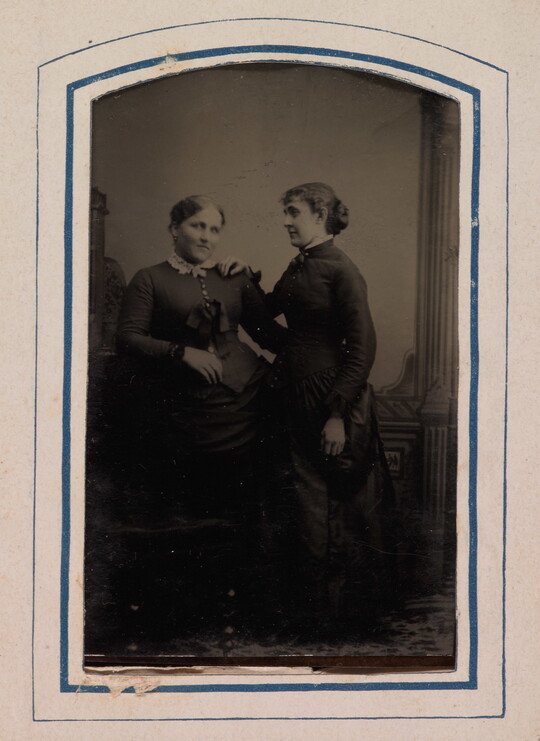 [Seated couple, arms resting on chair], ca. 1850-1860