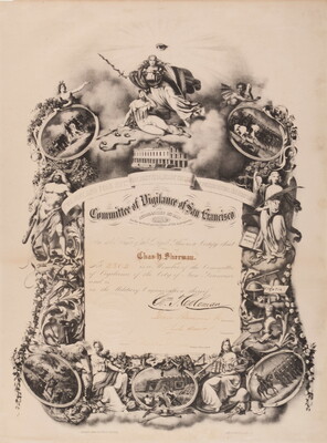 c.: In the name of the people this is to certify that / Chas:h. Sherman. / No 2303 is a number of the committee / Vigilance of the city of San Francisco / and is / in the Military organization there of / [signature] Wm T. Coleman President / [signature] Isaac Bluxome Secretary / [unknown signature] Treasurer / [unknown signature] Grand Marshall.