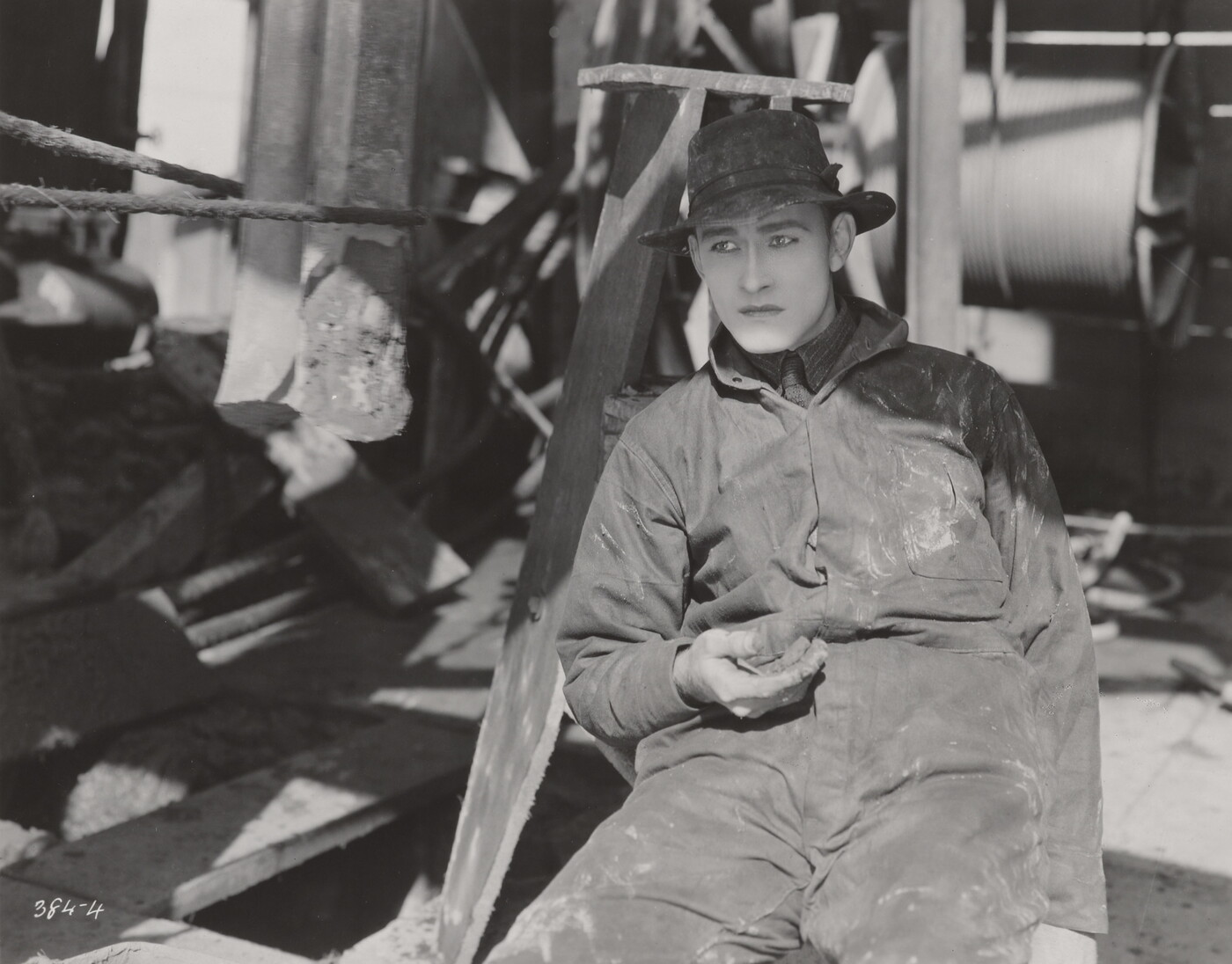[Conrad Nagel in uniform, sitting near industrial machinery, "Fool's Paradise"]