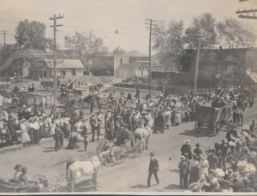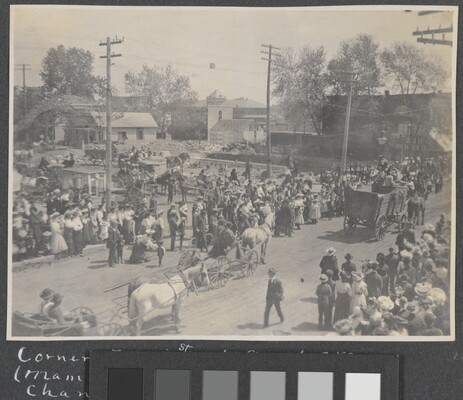 l.l. to l.r. in ink: Corner Main St. and Grant Ave. \ "Mammoth Racket Corner." \ Chanute Kans. May 10th 1904.