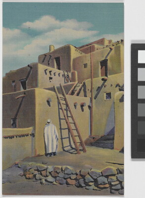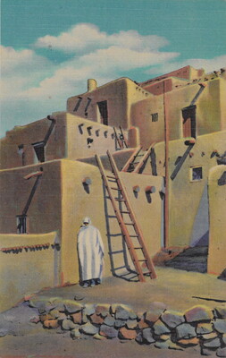 u.l. printed: 213 - A CORNER IN TAOS PUEBLO, \ TAOS, N.M. \ The white blanket worn by this Taos Indian \ contrasts sharply with the brown adobe walls \ of ancient Taos Pueblo, located in northern \ New Mexico. Taos Indians wear white \ blankets in winter. Silhouetted against the \ sky on the tops of the houses at sundown, \ they make unforgettable pictures. \ N.M. TOURIST BUREAU
