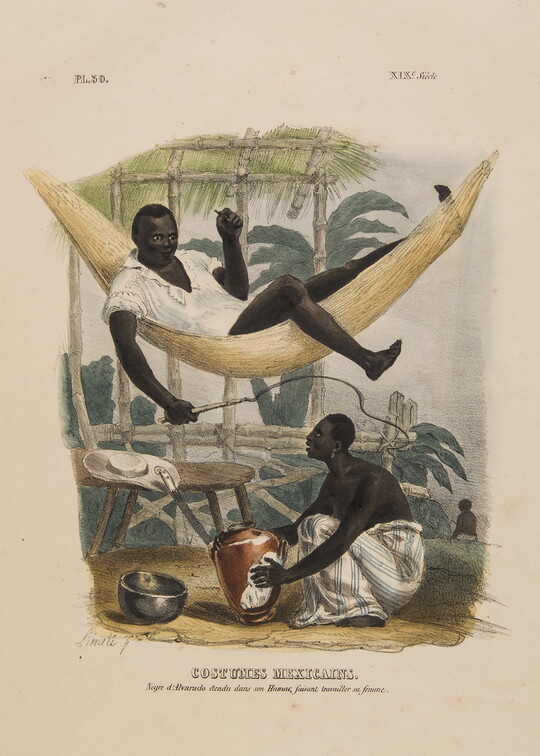 Costumes Mexicains. Negre d'Alvarado etendu dans son Hamae, faisant travailler sa femme., 1828