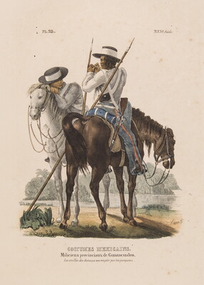 l.c.: COSTUMES MEXICAINS. \ Miliciens provinciaux de Guazacualco. \ Les oreilles des chevaux sont rongées par les garapatas.