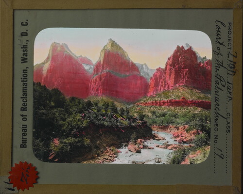 u.r. to l.r. printed along right edge: PROJECT [in ink] Zion Park [printed] CLASS.............. \ [in ink] Court of the Patriarch [printed] NEG. NO. [in ink] 19
