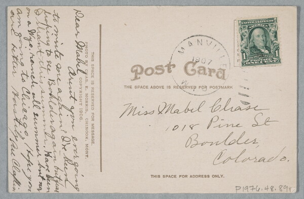 c. to l.r. in ink: Miss Mabel Chase \ 1018 Pine St \ Boulder, \ Colorado.